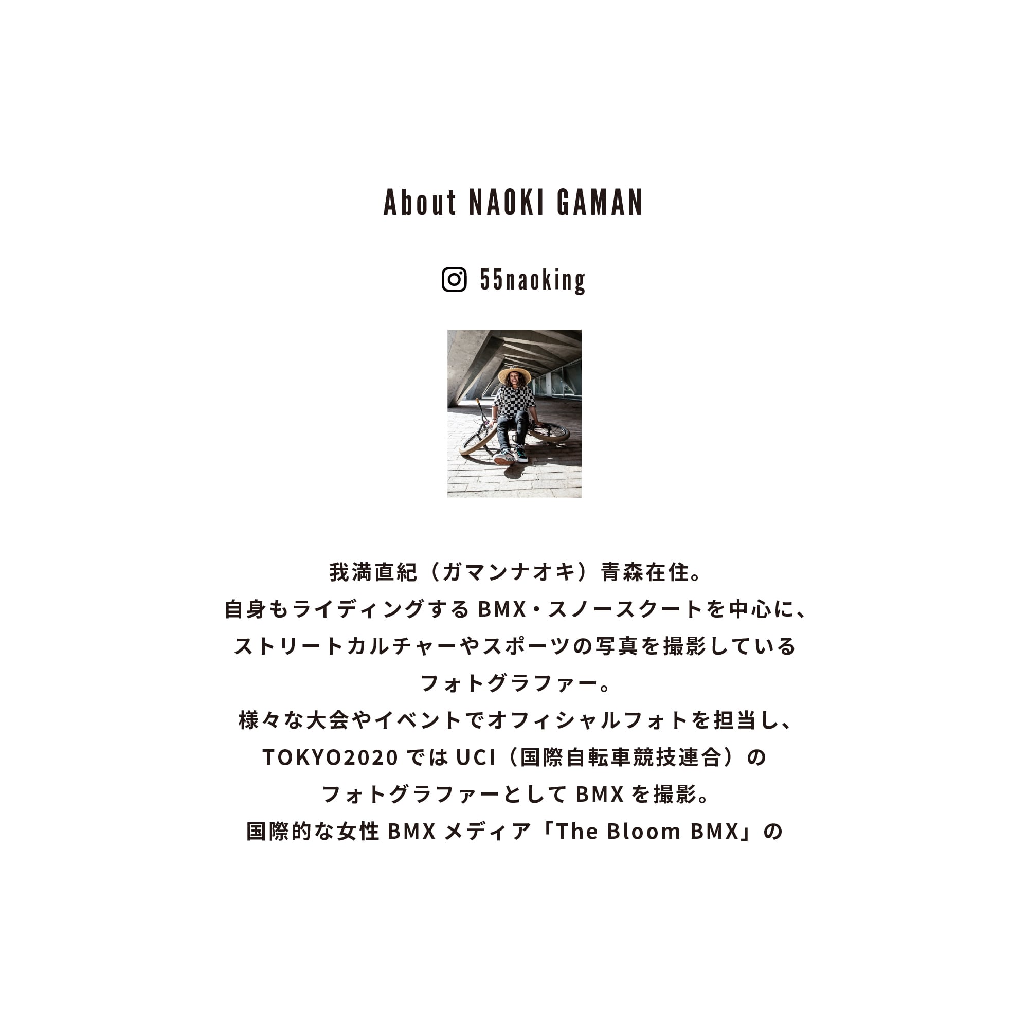 自身もライディングするBMX・スノースクートを中心に、ストリートカルチャーやスポーツの写真を撮影しているフォトグラファー。様々な大会やイベントでオフィシャルフォトを担当し、TOKYO2020ではUCI(国際自転車競技連合)のフォトグラファーとしてBMXを撮影。国際的な女性BMXメディア「The Bloom BMX」のメンバーとしても活動中。